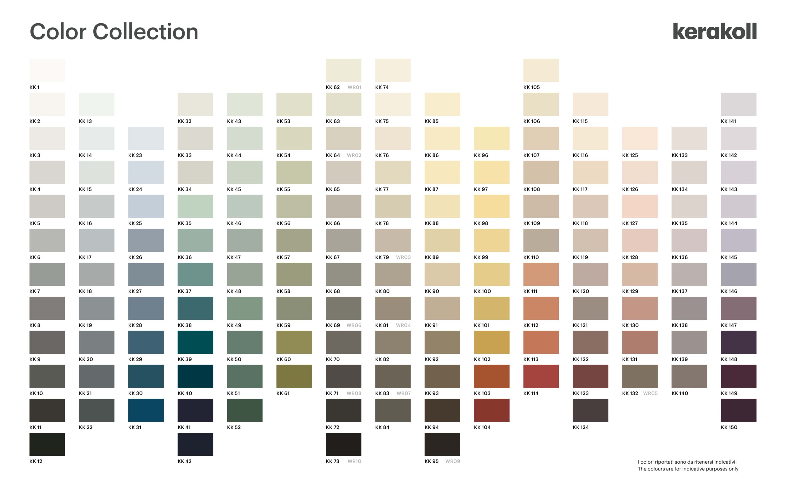 La palette colori di Color Collection è composta da 150 tonalità sofisticate, organizzate in 15 scale cromatiche verticali: da bianchi delicati e toni pastello a colori più scuri e dalla elevata saturazione, che ben si prestano a combinazioni armoniche.