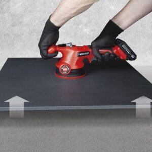 La ventosa, attivabile semplicemente con una leva ad eccentrico permette il sollevamento sino a 25 Kg e può essere mantenuta in depressione per vibrare la piastrella una volta posata, mentre viene consigliato lo sgancio della ventosa per poter eseguire l’operazione di vibratura con movimento circolare dall’interno della piastrella verso l’esterno indicato in particolare per grandi formati o lastre sottili.