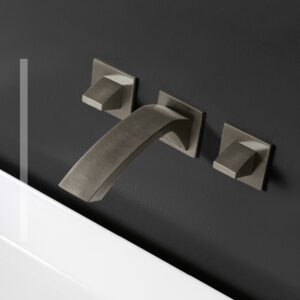 La linea di rubinetti Archè, che comprende miscelatori per lavabo, per il bidet, per la vasca e un soffione doccia, è disponibile in diverse finiture: