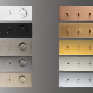 Marco Baldini è la mente che ha dato vita a queste straordinarie fusioni tra luce e acqua: uno spirito vintage, ridisegnato in un’ottima moderna, che attinge a piene mani dal mondo dell’elettricità. Placche elettriche, come quelle di un tempo, che emettono getti d’acqua al posto della luce, trasformando la propria funzione e la propria applicazione. I comandi ricordano quelli delle vecchie radio a transistor, in un cortocircuito di stile e rilettura.