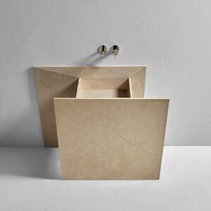 Un’architettura di piani sfalsati, un volume tridimensionale generato dal rapporto tra superfici parallele e ortogonali e dai vuoti che si creano dalla loro disposizione nello spazio, come avviene nello skyline di una città, nell’alternanza tra ambiente costruito e spazio libero. Una presenza scultorea ottenuta esclusivamente attraverso linee rette, una forza generatrice che nasce dall’acqua e dalla sua azione primordiale, un origami di marmo che sembra essere uscito dalla parete alla quale era stato accostato per esprimere tutta la forza della materia. Si chiama proprio Skyline il lavabo in marmo che nasce da una concezione architettonica dell’oggetto per generare una composizione dinamica fatta di profondità, prospettive, luci e ombre. In un costante dialogo con la luce e le sue infinite direzioni la materia prende vita per generare un lavabo essenziale ed elegante allo stesso tempo, nel quale il disegno minimale delle superfici lascia alla materia la libertà di esprimersi e conferire carattere all’insieme. Un linguaggio contemporaneo, una sovrapposizione di due fogli che visti frontalmente nascondono il bacino e non rivelano la funzione primaria ma che allo stesso tempo invitano alla scoperta lasciando aperti trasversali spiragli di luce.
