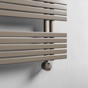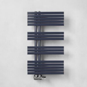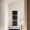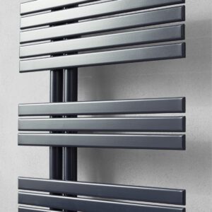 Scalda salviette in acciaio, a interasse 50mm, realizzato con tubi verticali diametro 35mm e doghe piatte orizzontali da 35mm.