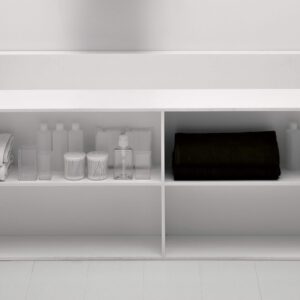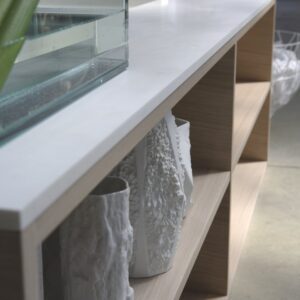 Spazi utili per organizzare lo spazio ma anche per personalizzare l’esperienza, volumi ricavati nel fianco che si allarga e diventa un pratico piano d’appoggio. Versatile perché può essere posizionata free standing o incassata, può integrare un piano rialzato a cui accedere con uno scalino. Democratica, perché può essere inoltre accostata a parte su qualsiasi lato, scegliendo il fronte tradizionale o quello nel quale sono ospitati i libri. Personalizzabile, perché la piccola libreria integrata può assumere un carattere diverso qualora venga rivestita con essenze o definita da colori particolari.
