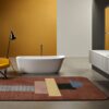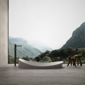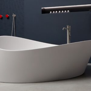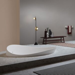 Accogliente e priva di discontinuità, non presenta un fronte privilegiato e può assumere configurazioni diverse sia nella versione free standing che in quella a semi incasso. Le continue variazioni di altezza del bordo è il tratto distintivo di una proposta di carattere ma allo stesso tempo versatile e flessibile.