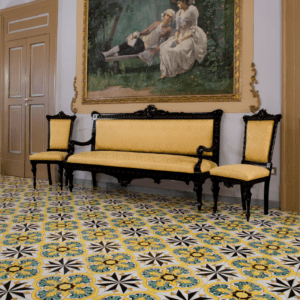 Cromia 1369 è realizzata con un’antica tecnica artigianale di decorazione, che dona calorose vibrazioni per le striature del passaggio del colore sulla piastrella.