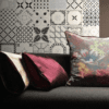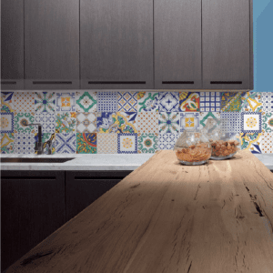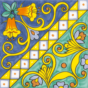 Giovanni De Maio riprende una tipica tradizione vietrese del dopoguerra, che prevedeva l’uso delle disponibilità di magazzino miscelandole in modo casuale, richiamando l’arte del patchwork.