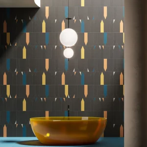 Dal taglio del formato 8,2×33,3 in pietra compattata nascono 10 diverse combinazioni dove colori e geometrie si mixano.