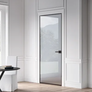 Le sue caratteristiche principali includono un telaio in alluminio che viene installato direttamente nella parete, che sia essa in muratura o cartongesso. Questo assicura una stabilità strutturale senza pari, oltre a mantenere il design senza compromessi. La porta è dotata di cerniere a scomparsa e serratura magnetica, garantendo un’apertura e una chiusura fluide ed eleganti.